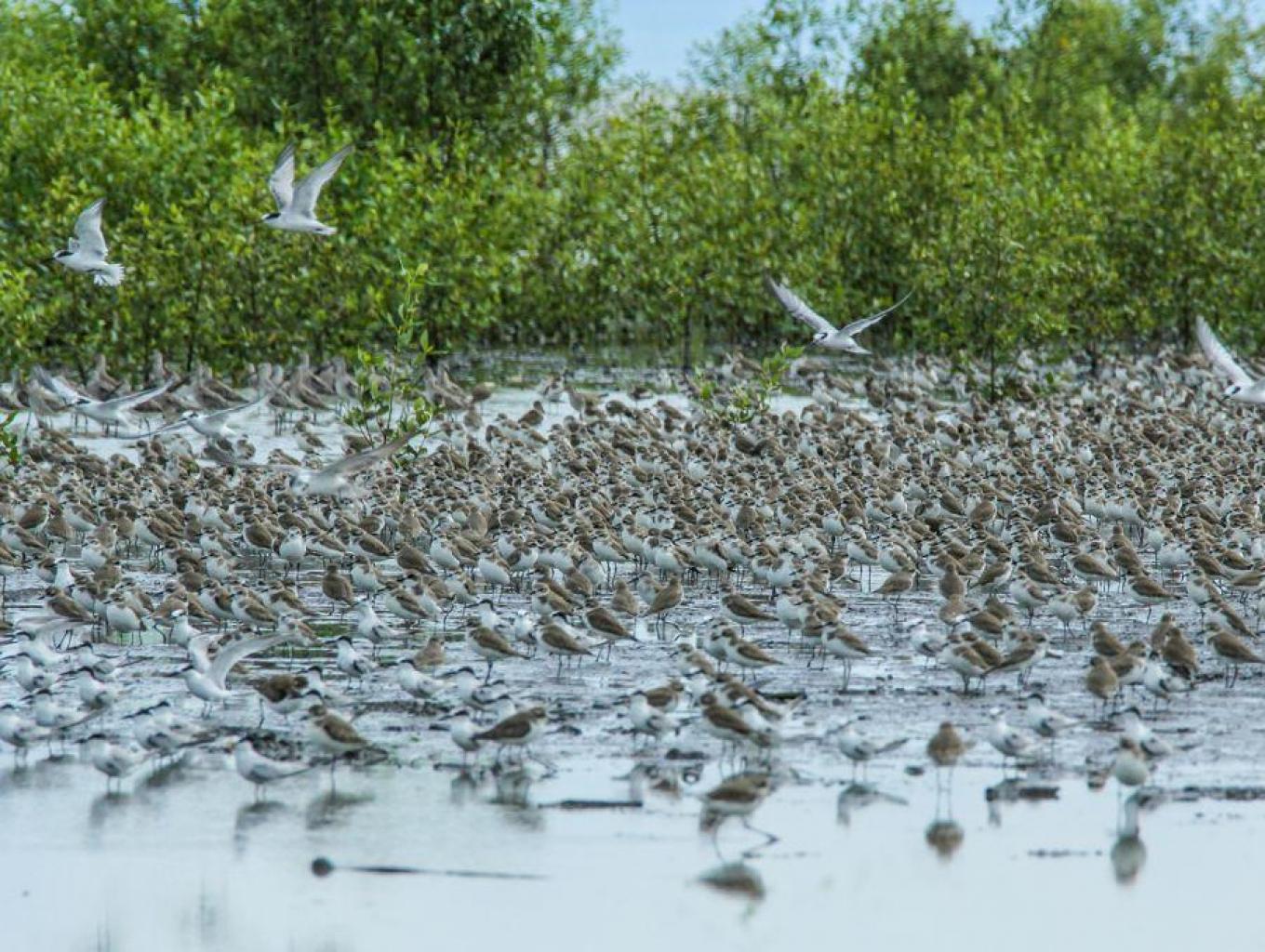 menikmati pemandangan ribuan burung-burung yang bermigrasi ke Taman Nasional Sembilang