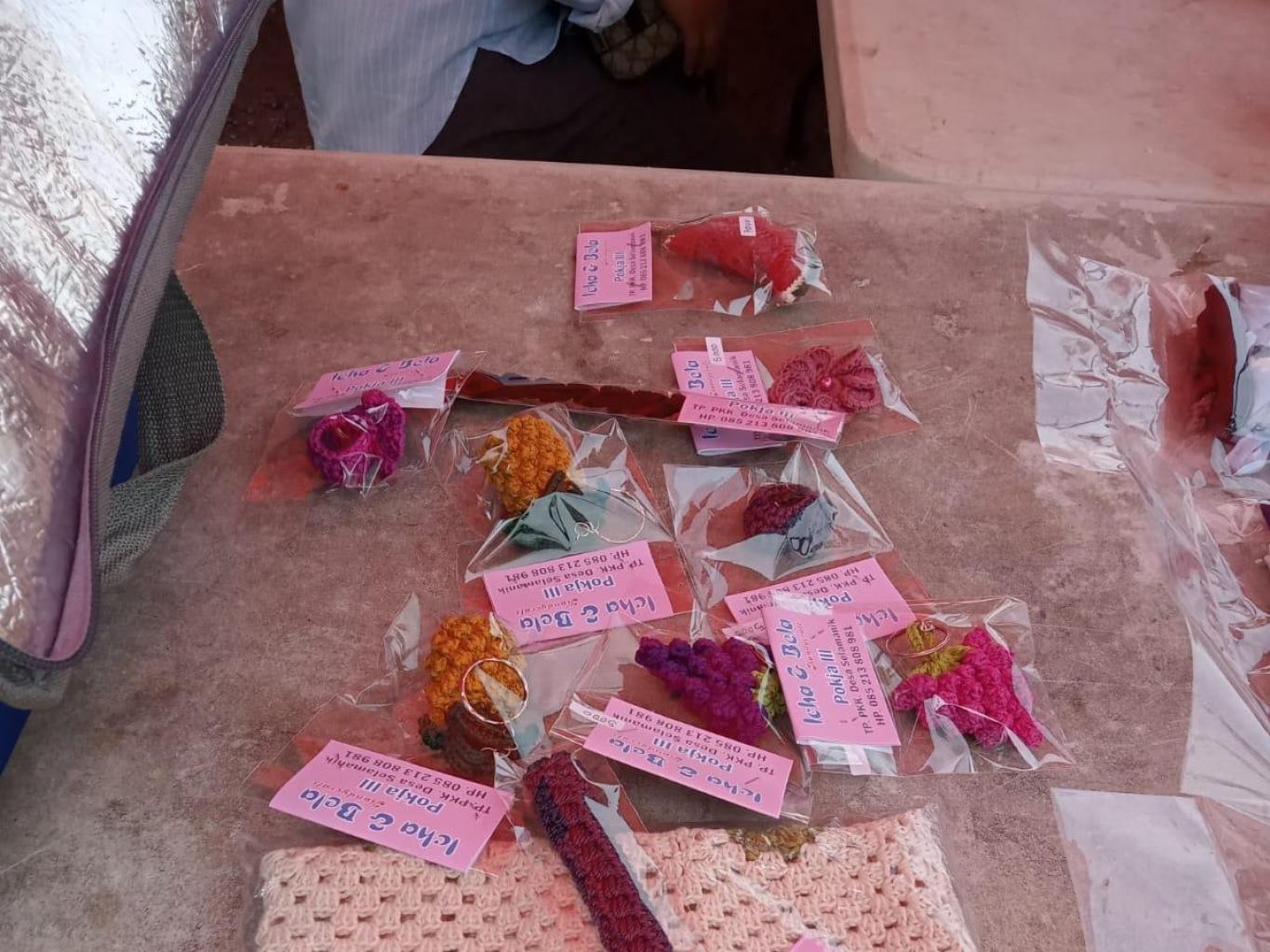 Asesoris Rajutan ini di buat dengan keterampilan ibu-ibu PKK yang produktif untuk bisa meningkatkan pendapatan ibu-ibu PKK. Banyak macam dari hasil kerajinan rajutan diantarnya tas, kotak tisu, dompet dll.