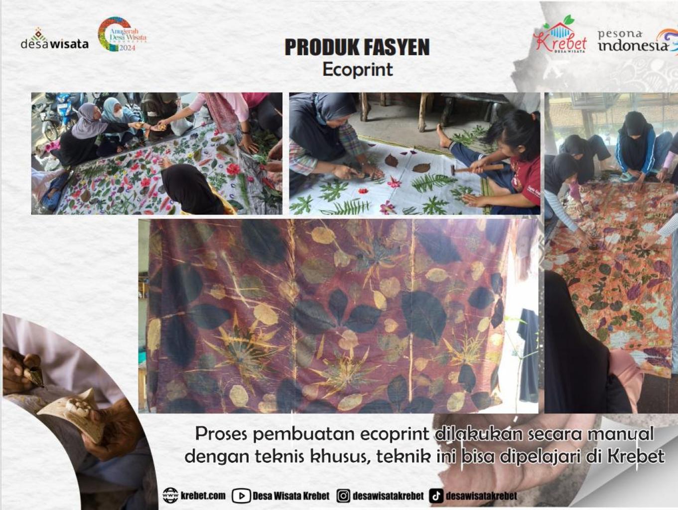 Ecoprint adalah sebuah teknik pencetakan tekstil alami yang menggunakan tumbuhan, daun, dan bahan-bahan organik lainnya untuk menciptakan pola dan warna pada kain. Proses ini melibatkan penempatan bahan-bahan organik di atas kain yang telah diolah dengan bahan kimia alami, seperti tannin dari kulit pohon atau zat pewarna dari tanaman tertentu. Kemudian, kain tersebut dibungkus dan direbus dalam air panas untuk menghasilkan cetakan alami yang unik.