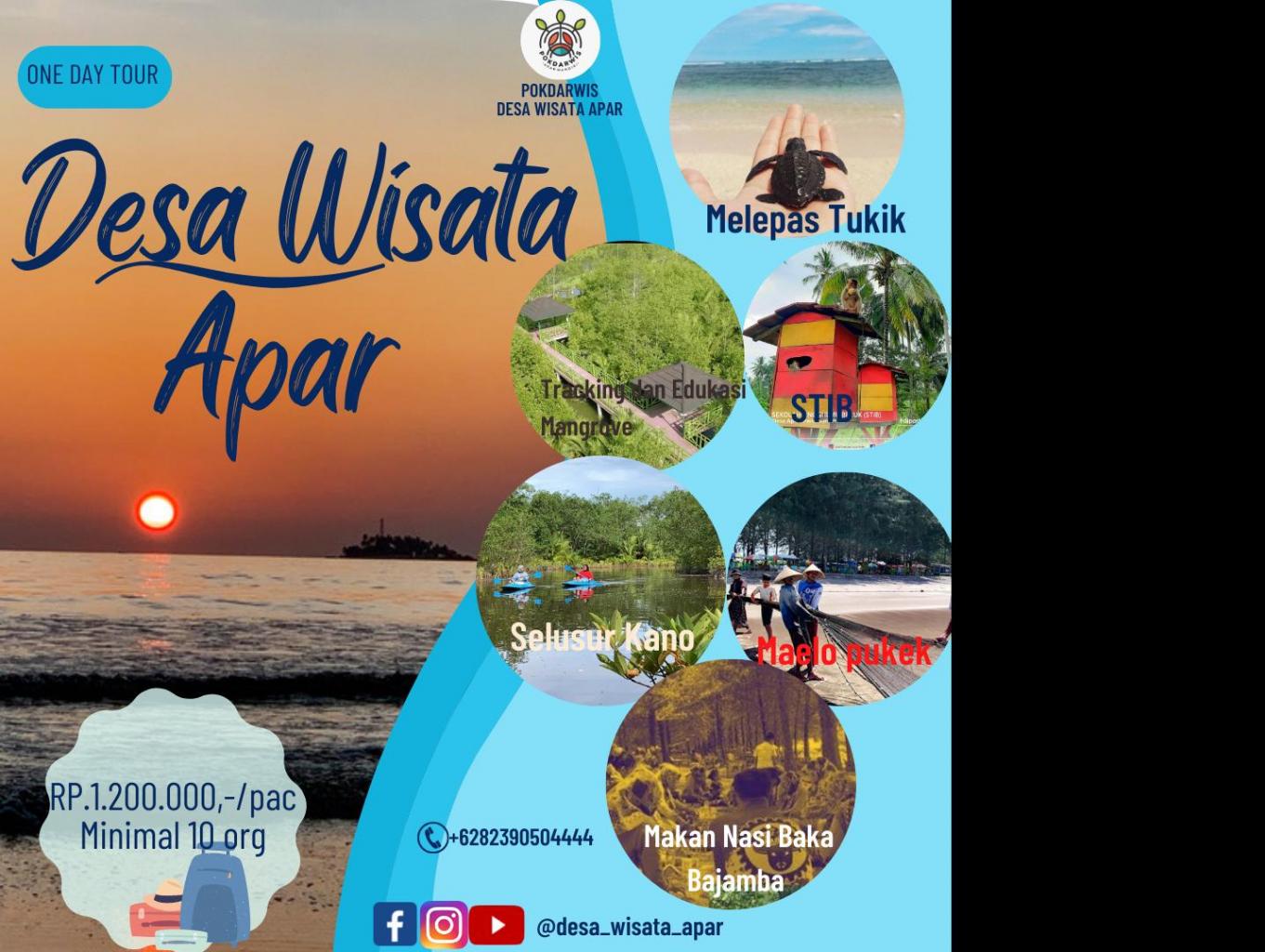 one day tour desa wisata apar adalah satu paket sehari di desa wisata apar.dimana kita akan di suguhkan keindahan hutan mangrove desa wisata apar,pantai yang indah,melakukan aktifitas keseharian masyarakat desa apar seperti maelo pukek,makan nasi baka kas desa wisata apar,mengunjungi sekolah tinggi ilmu baruak, melepas tukik atau anak penyu dan menyusuri aliran sungai hutan mangrove dengan kano.di sisi akan di dapati pengalaman yang sangat menarik di desa wisata apar sendiri.